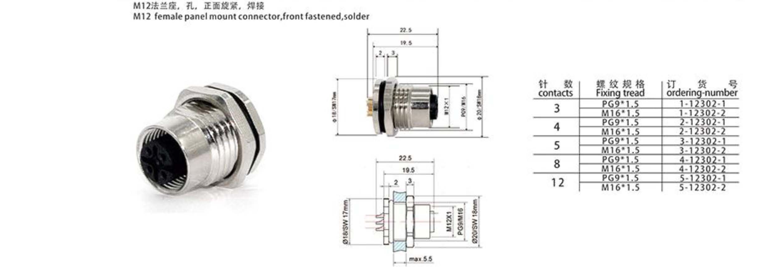 M12-5P法蘭母座連接器 3-12302-1