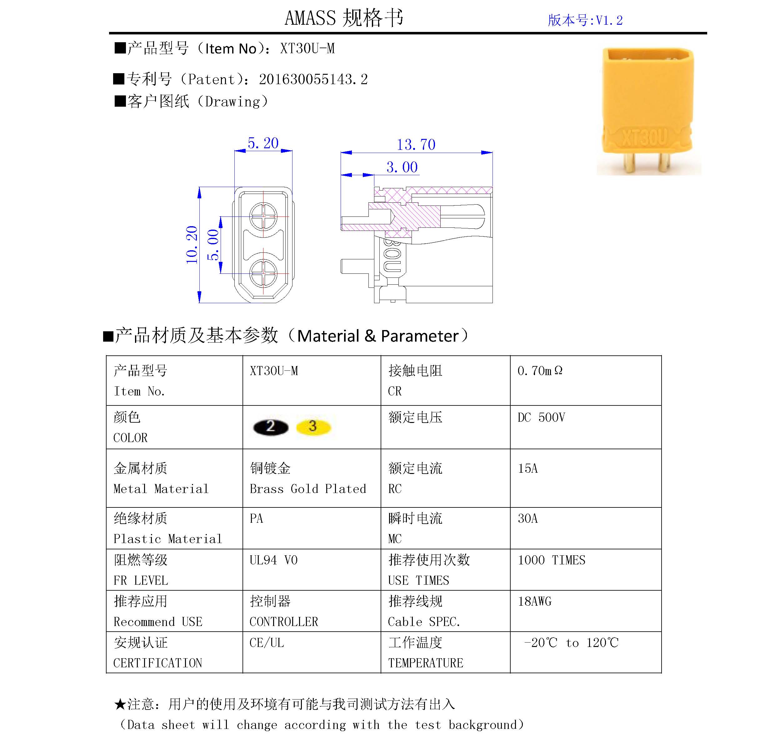 XT30U銅鍍金公插頭