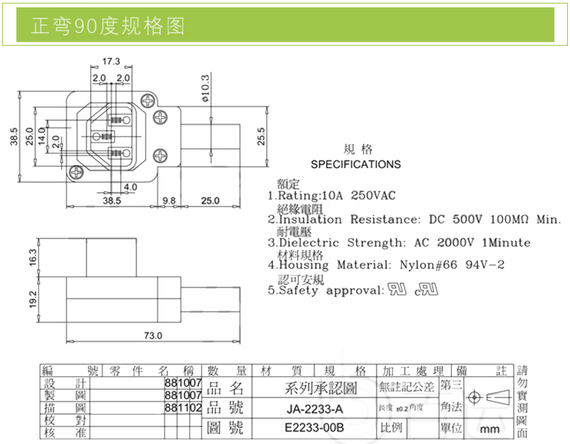 JEC_電動車品字插頭純銅 正彎90°公頭