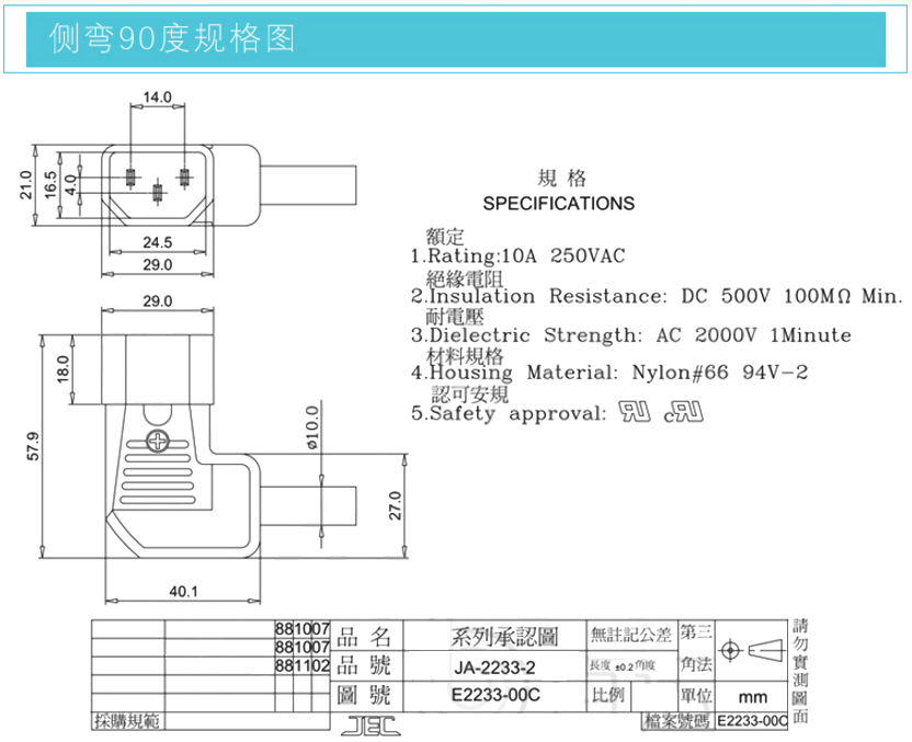 JEC_電動車品字插頭純銅 側彎90°公頭