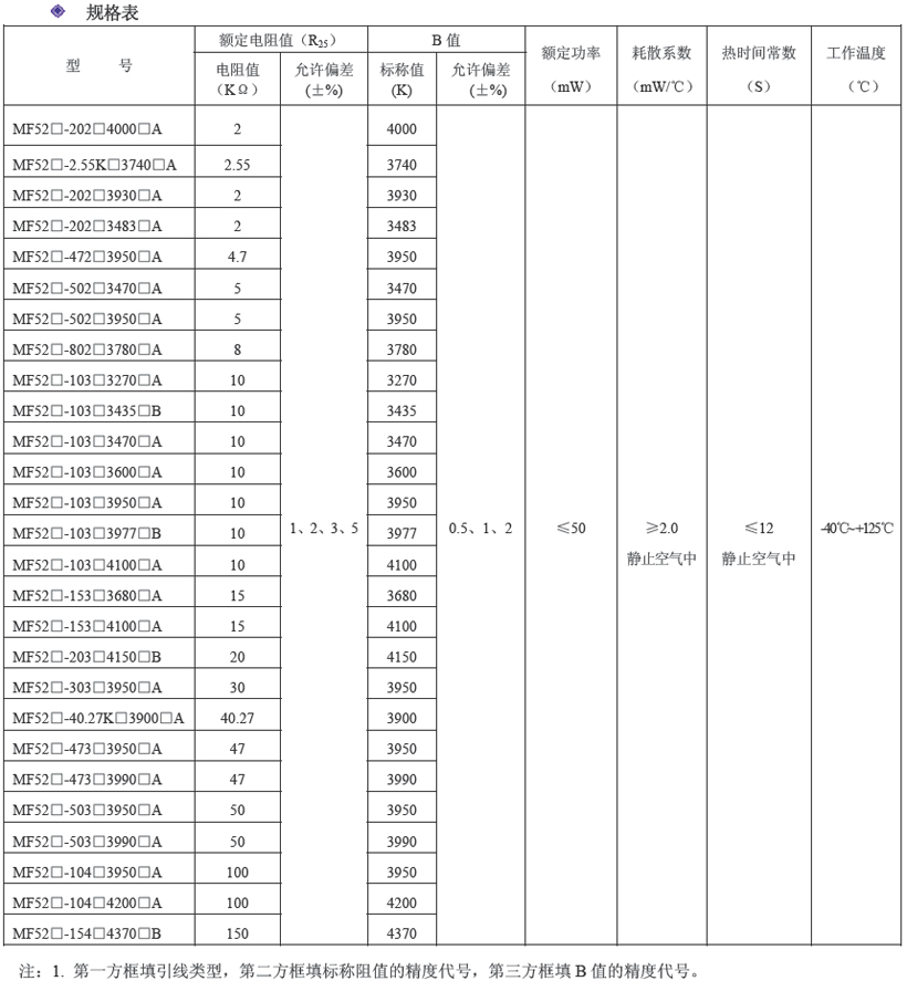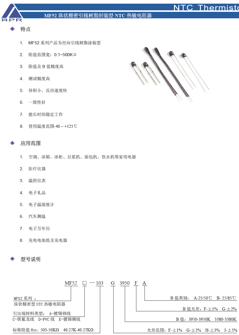 | 12335 | MF52E-103F-3950-FA | MF52 | 10KΩ±15% | 3950K±1% | -20℃ | +125℃ |
