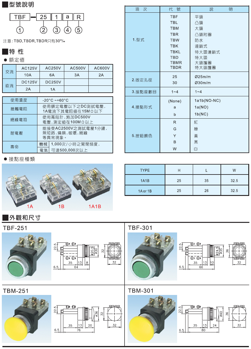 | 12428 | TBF-251-G | 綠平頭∮25mm | 1a1b(NO-NC) | 4 |