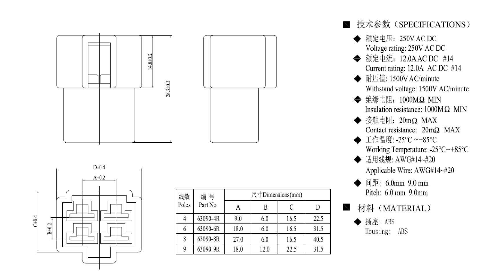 (9.0/6.0mm) 6.3汽配 4P 針端子的外殼