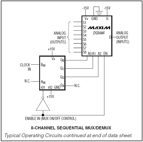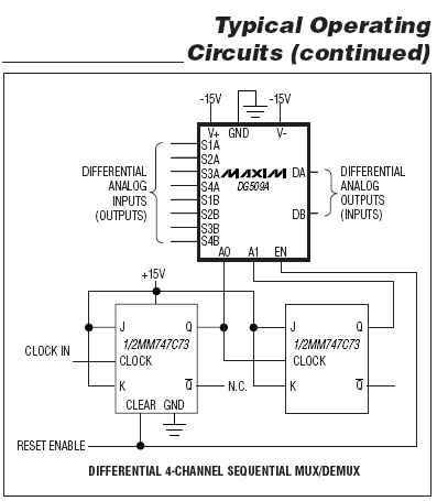 Both devices guarantee break-before-make switching. Maxim guarantees these muxes will not latch up if the power supplies are turned off with the input signals still present. Maxim also guarantees continuous operation when these devices are powered by supplies ranging