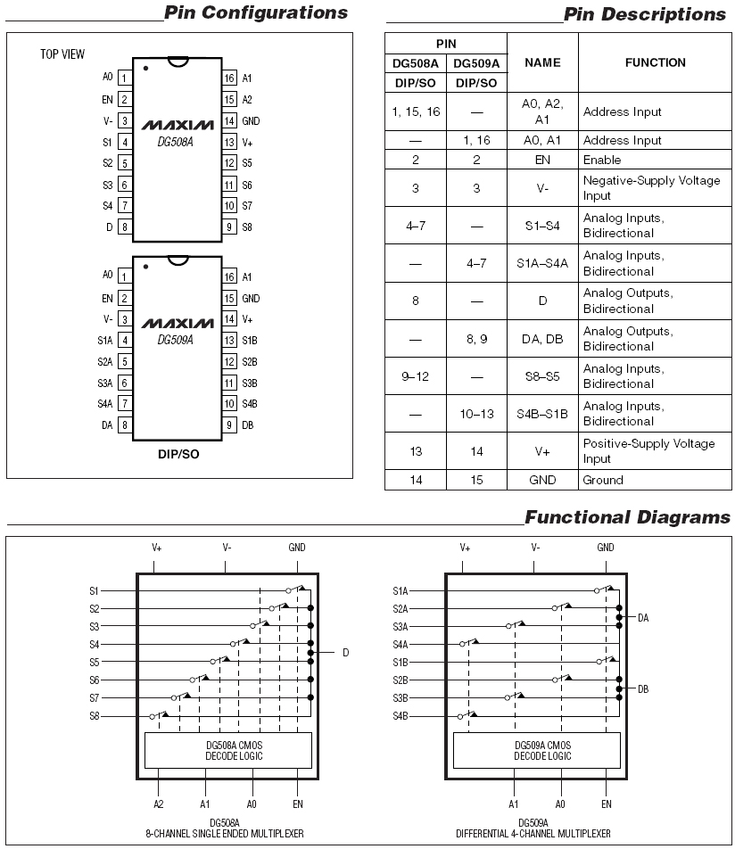 Maxim’s DG508A and DG509A are monolithic CMOS analog multiplexers (muxes): the DG508A is a single 8-channel (1-of-8) mux, and the DG509A is a differential 4-channel (2-of-8) mux.