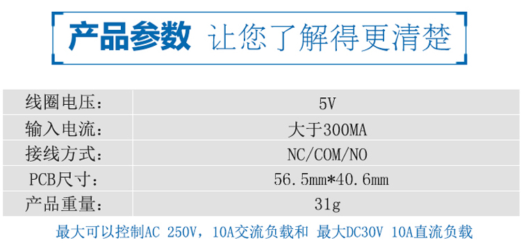 1. 繼電器為5V松樂繼電器,繼電器可以控制最大250V,10A交流負載和30V,10A直流負載