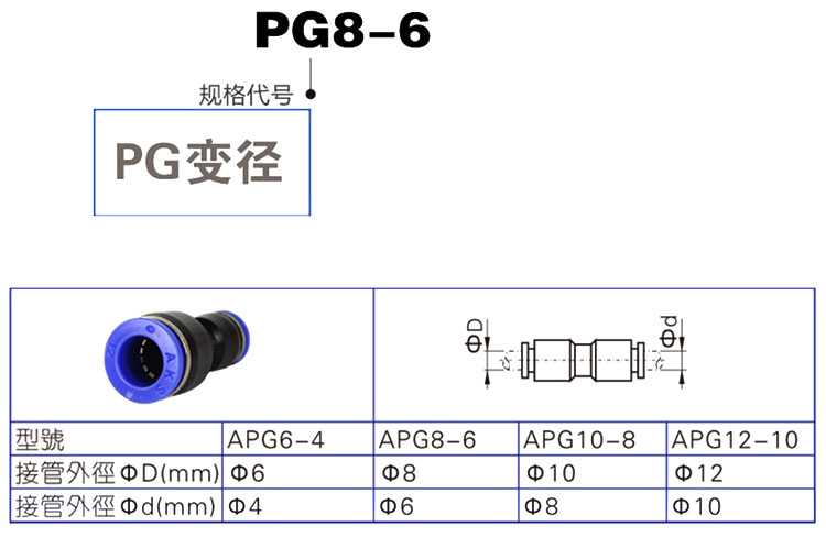 變徑兩通氣動接頭,接管外徑12~8mm