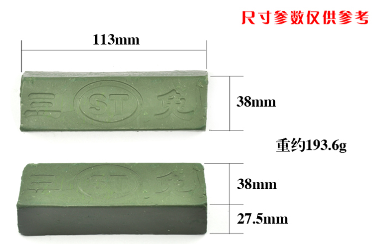 三兔牌綠色拋光臘具有理想的切削率和出光率,比白色更精細對於銅、不銹鋼、鋁、鎳、鉻等金屬製品的表面拋光十分理想,應配合布輪、羊毛輪等拋光輪使用。綠色臘為拋光的尾道工序,細拋,拋後工件程鏡面或高光效果。區別為前者帶青光、後者帶白光。如果要求不高的可以使用白色拋光膏即可