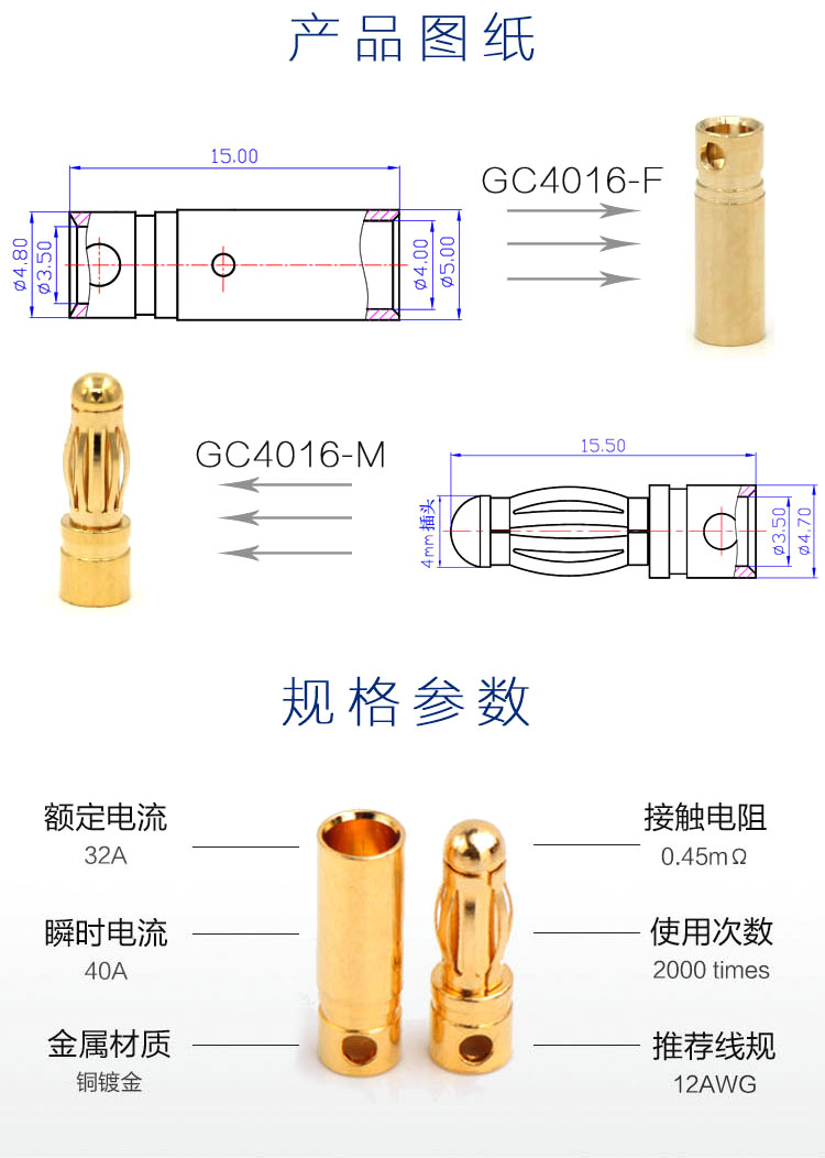 AMASS 4mm銅鍍7u厚金 香蕉母插頭(短)
