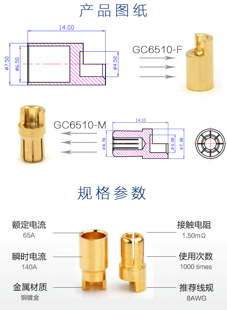 AMASS 6.5mm銅鍍7u厚金 香蕉母插頭 大電流