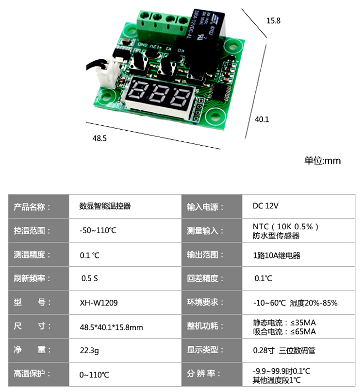 數顯溫控器12V藍光 48.5*40mm -50~110℃