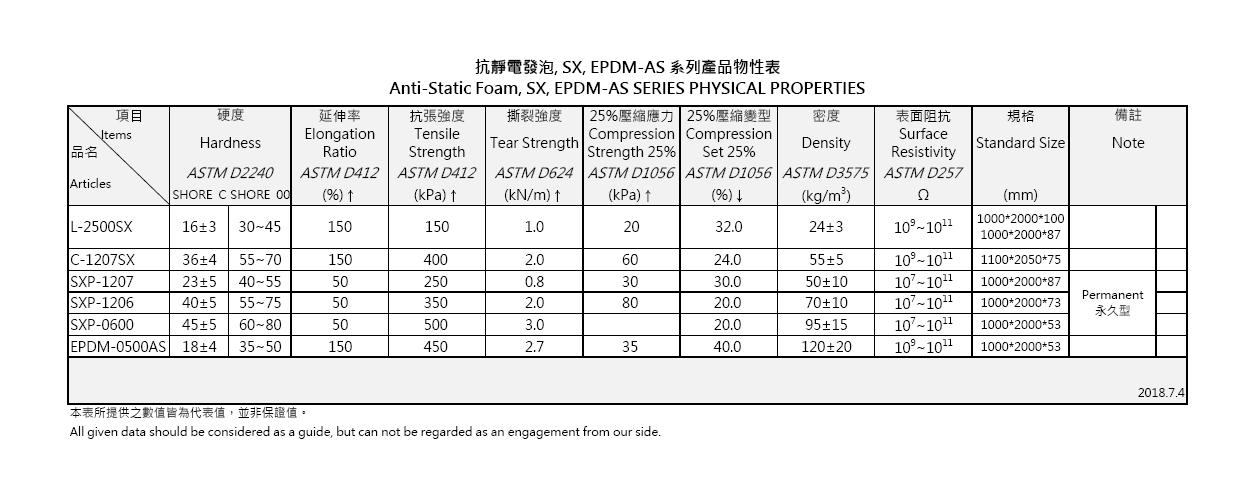 本系列產品具有優越的防止帶電能力,表面阻抗為109~1011Ω。目前本公司提供以PE/EVA為基材的SX系列,與使用橡膠發泡EPDM為基材的EPDM-AS系列。本產品適用於光電、半導體等相關產業。