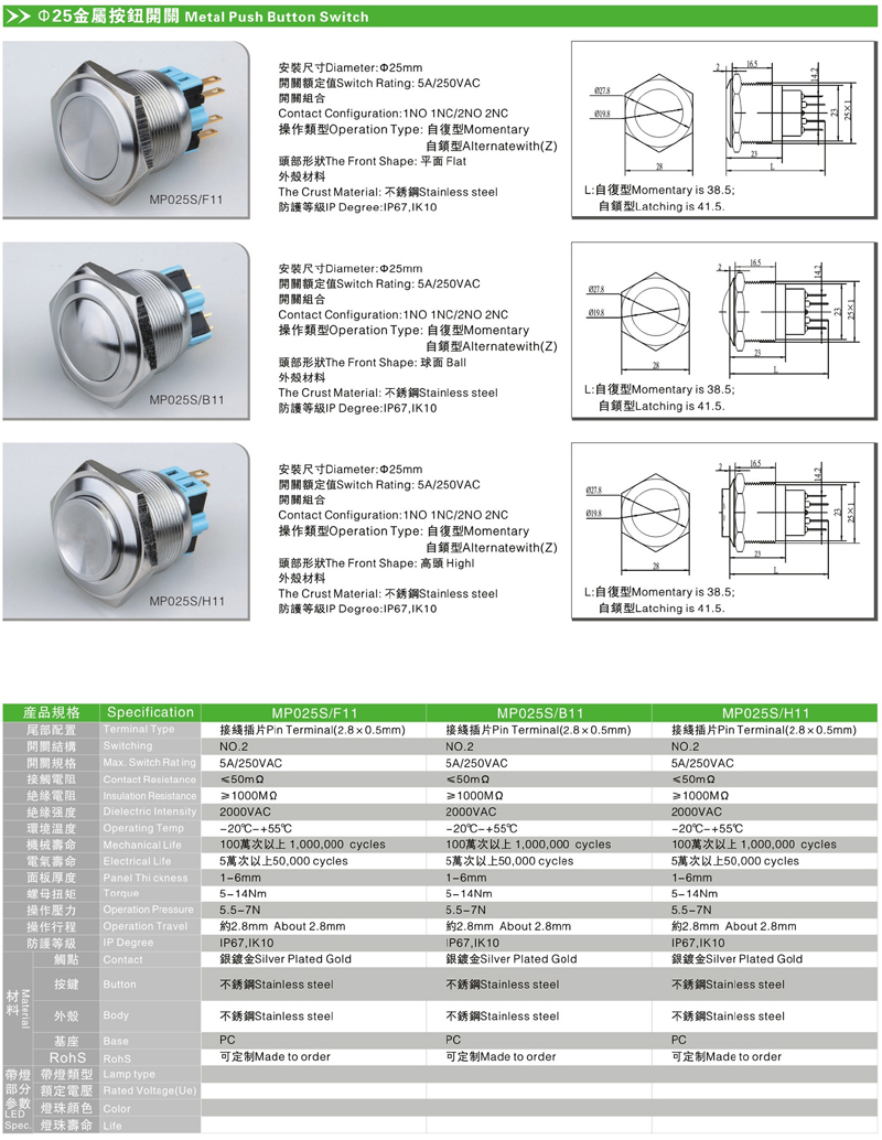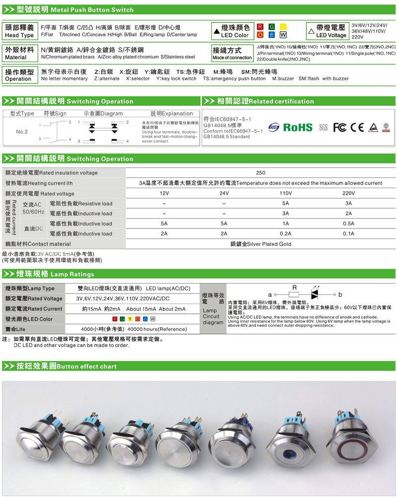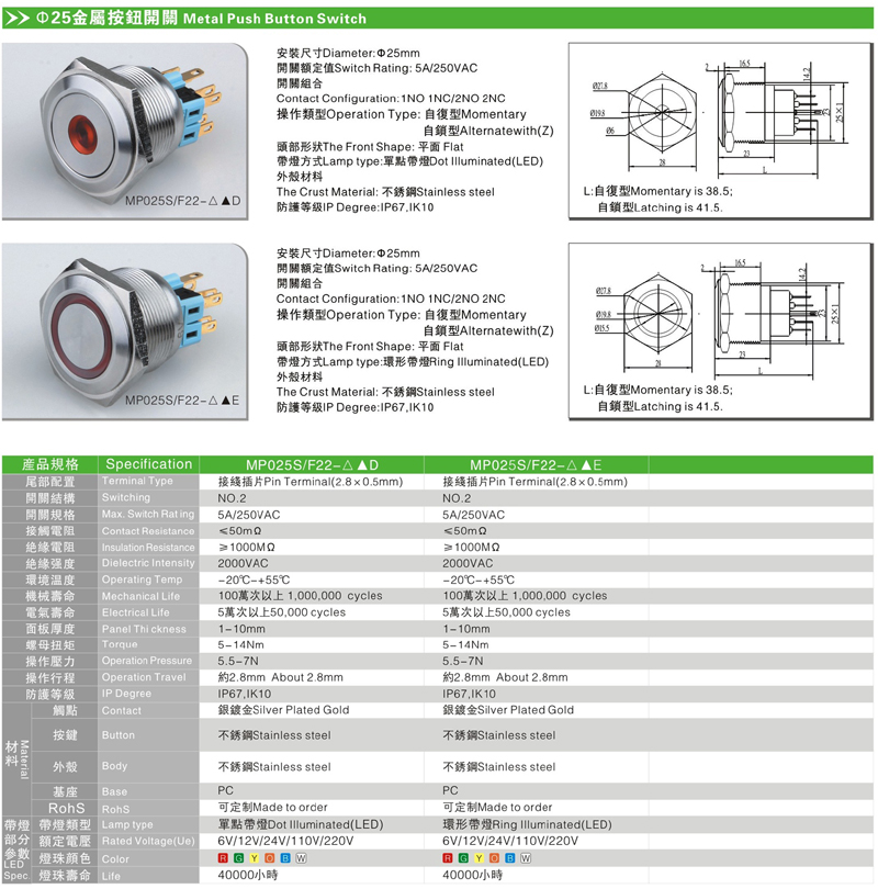 25mm不銹鋼環形自鎖帶燈按鈕 LED: 綠色 24V