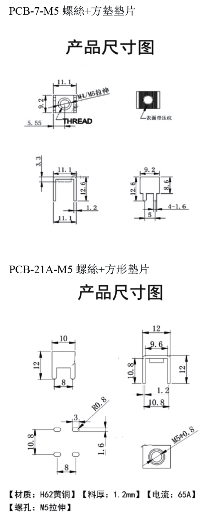 平面 PC板4腳焊接端子+M5方形墊片 腳距8*10.8MM