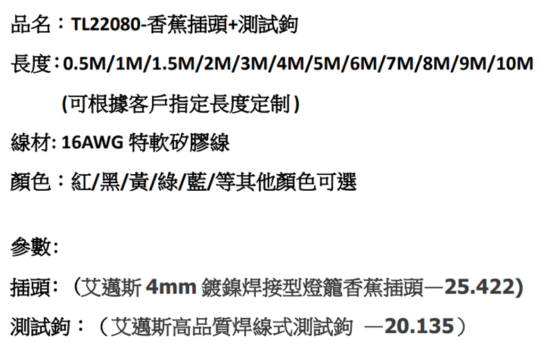 TL22080-香蕉插頭+測試鉤-16AWG-黃-1M