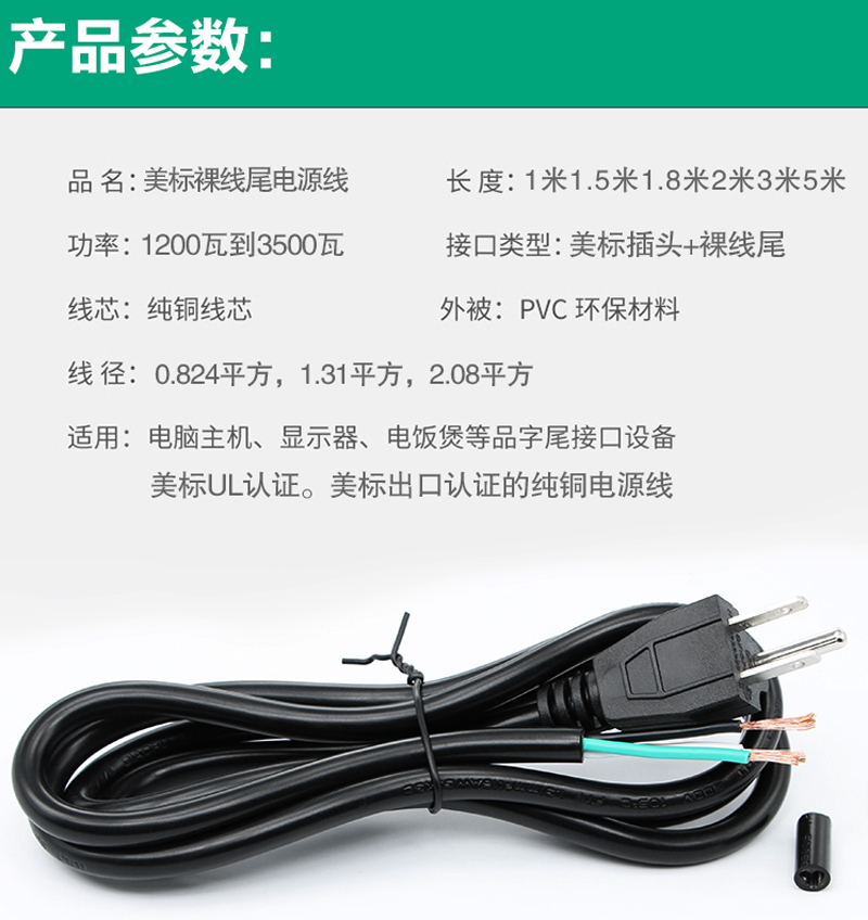 美規3P電源線+尾端剝皮-0.8平方-1M-黑