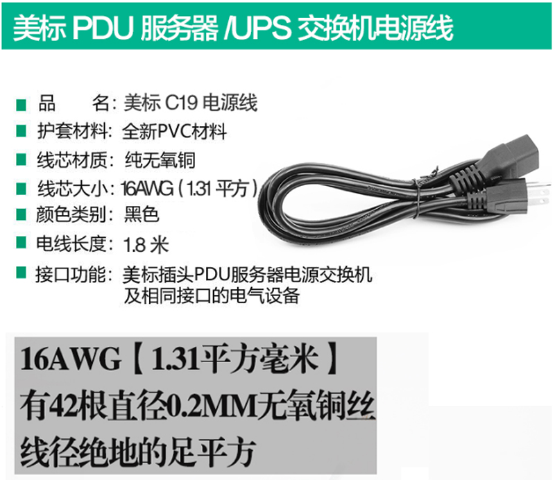 美規電源線-美標插頭轉接C19 1.3平方1.8米