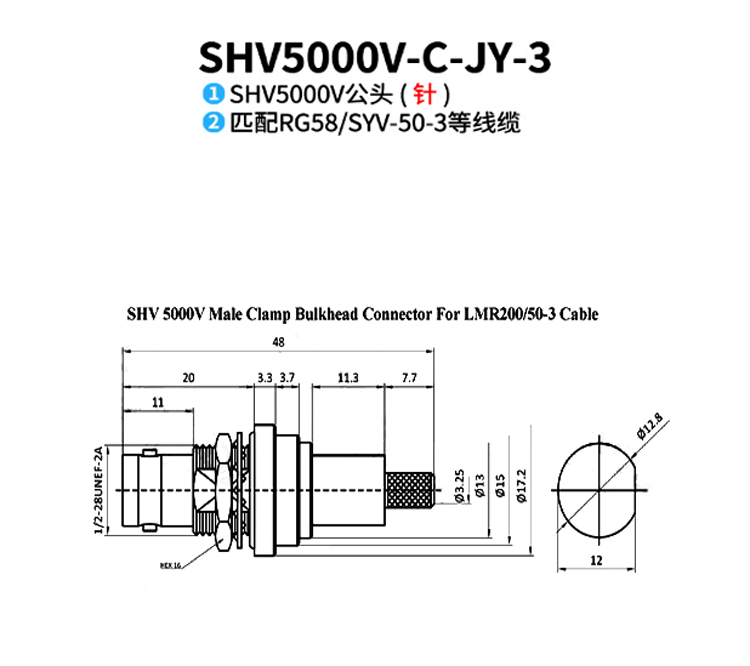 高壓插頭螺母固定式5000V公頭內針壓接50-3線連接器