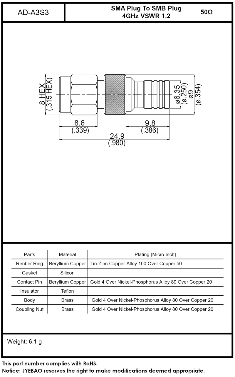 SMA Plug To SMB Plug Brass Gold 4GHz