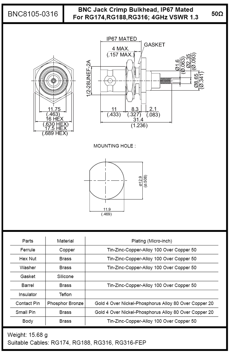 BNC Jack Crimp Bulkhead 4GHz