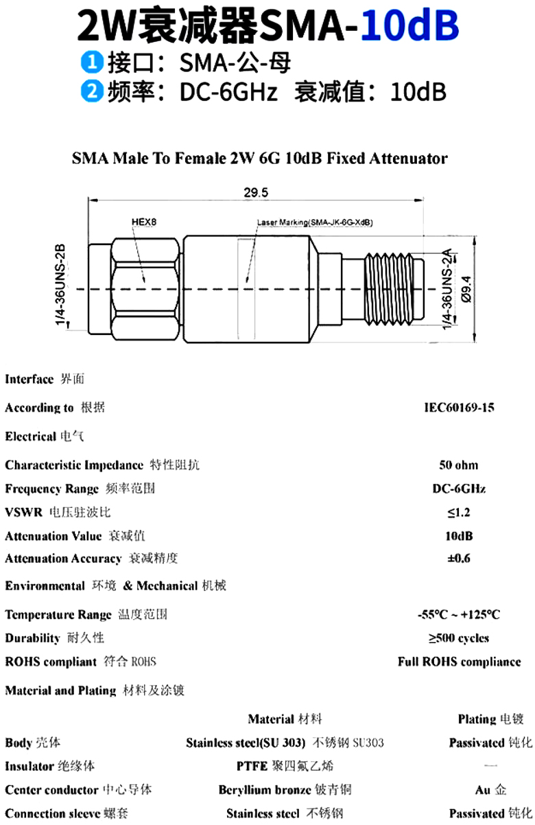 DC-6G固定衰減器10dB 不銹鋼2W SMA公轉母