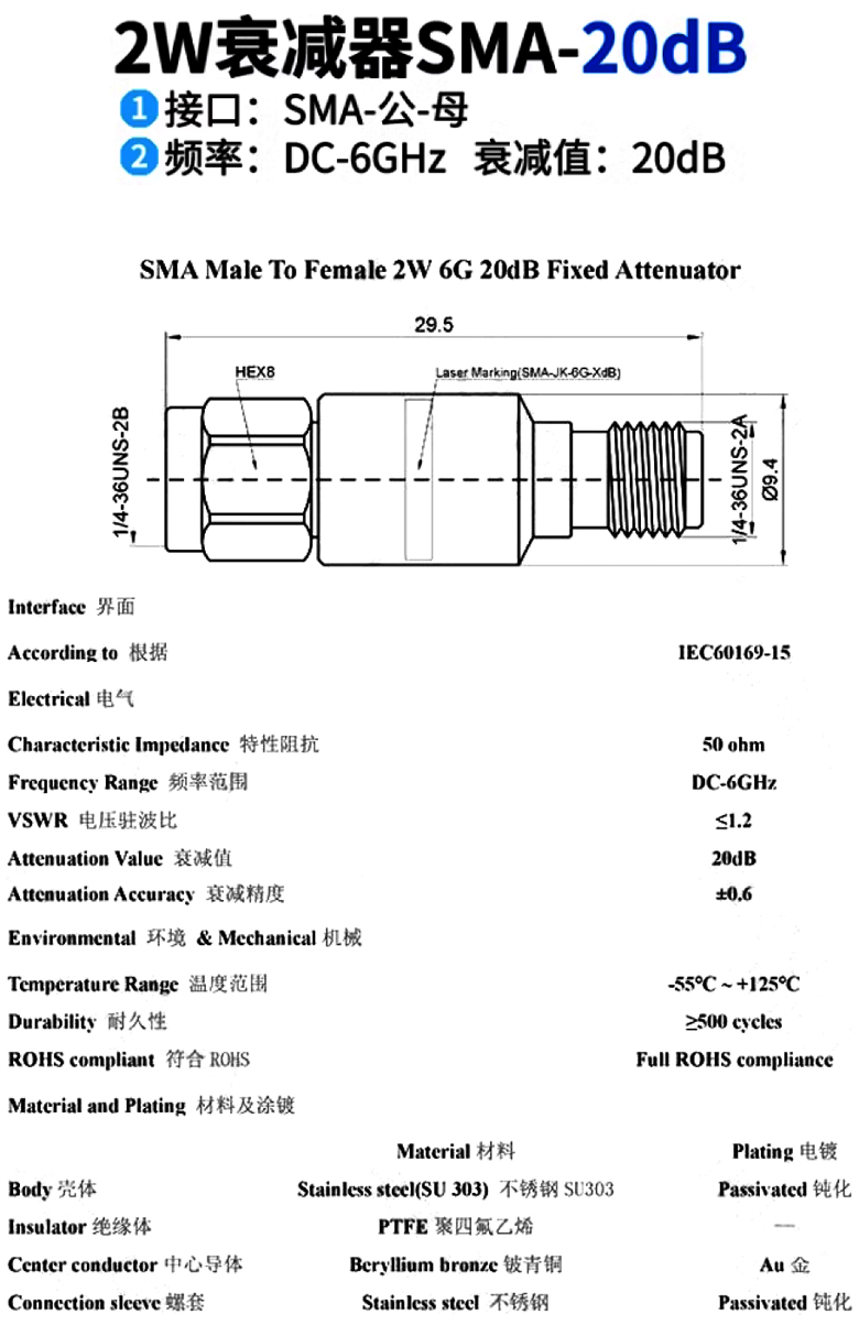 DC-6G固定衰減器20dB 不銹鋼2W SMA公轉母