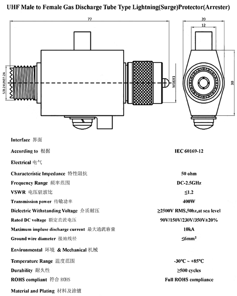 UHF鑽石避雷器CA-35RS中繼臺車載天線2.4G避雷器