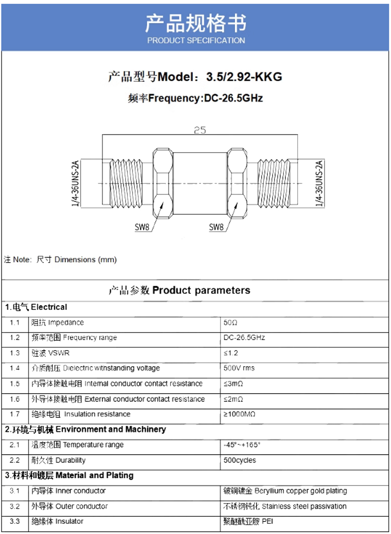 毫米波轉接器3.5母轉2.92母 DC-26.5G VSWR1.2/50ohm