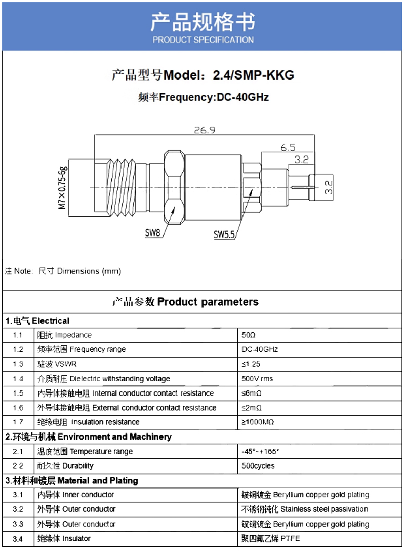 毫米波轉接器 2.4MM母轉SMP母 DC-40G VSWR1.25/50ohm