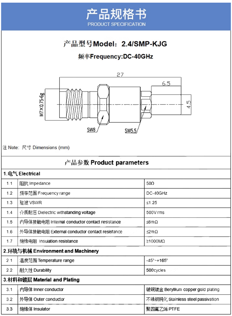 毫米波轉接器2.4MM母轉SMP公 DC-40G VSWR1.25/50ohm