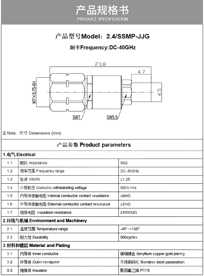 毫米波轉接器2.4MM公轉SSMP公 DC-40G VSWR1.25/50ohm