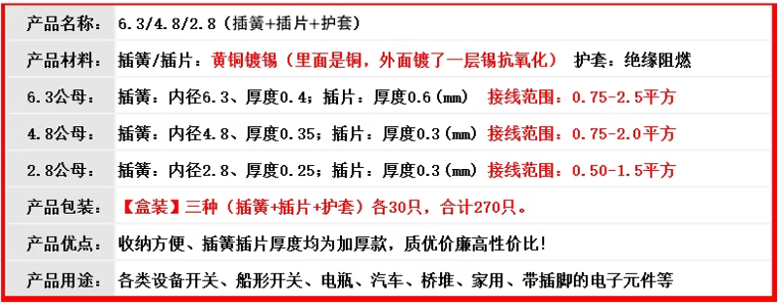 2.8/4.8/6.3母插簧+插片端子+護套-30套/盒裝