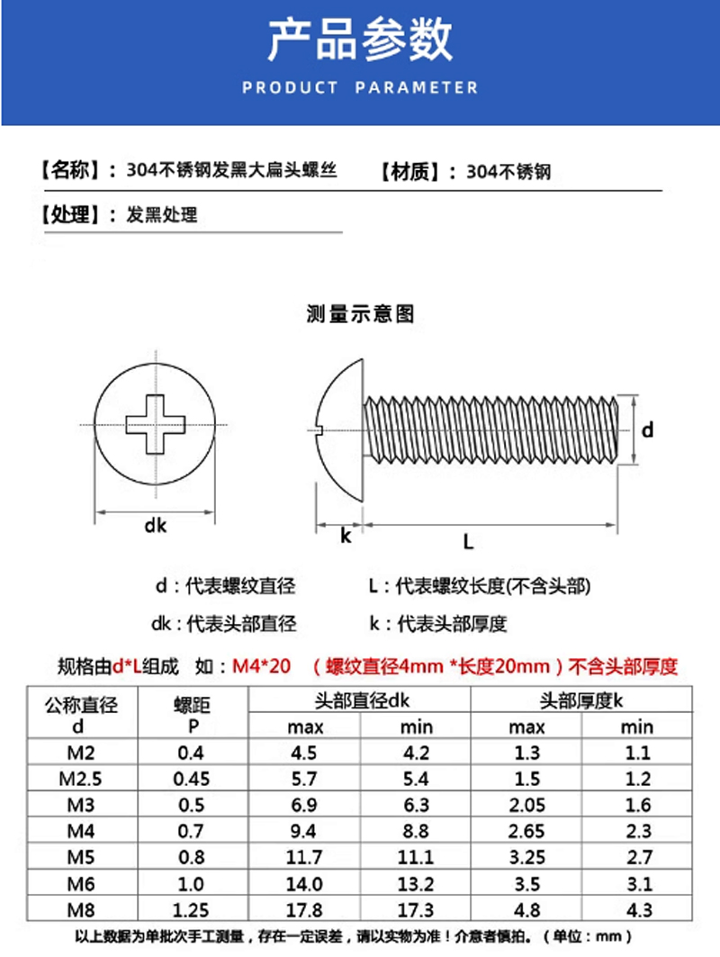 ⊕字黑色304不銹鋼十字大扁頭螺絲