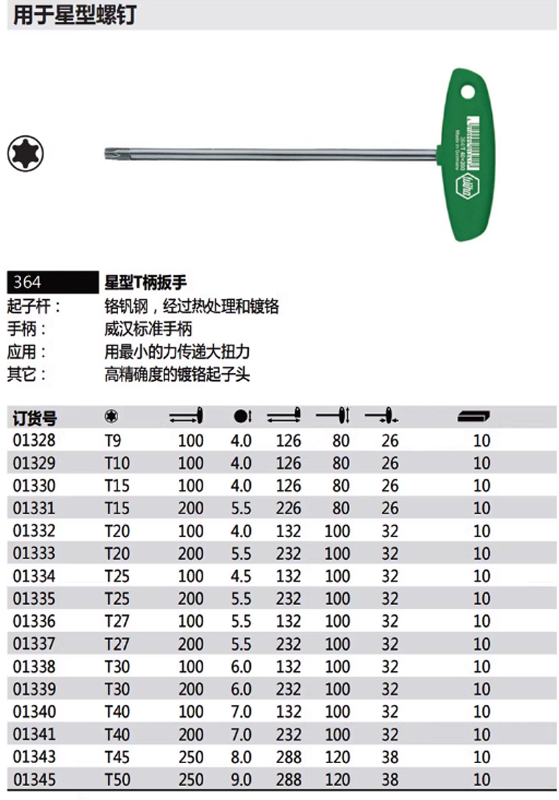 德國wiha 364系列T型 T15*100 梅花星型扳手