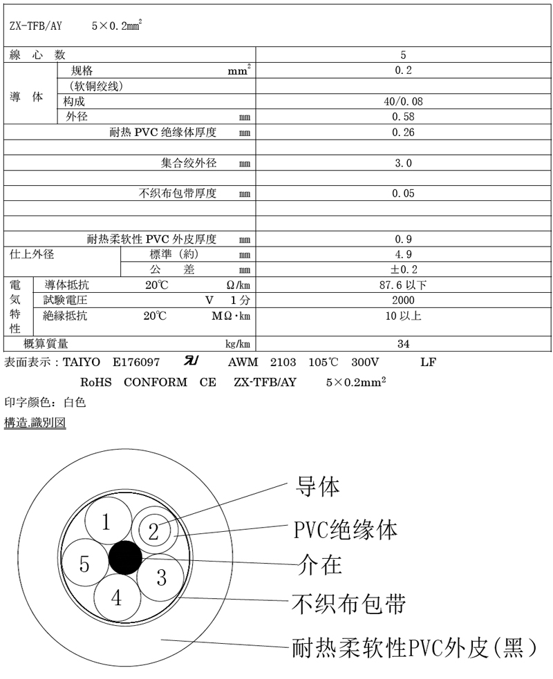 太陽牌耐彎曲拖鏈信號線 0.2mm2*5C 24AWG