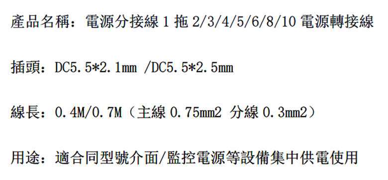 DC5.5*2.1MM一分六筆記本電源線0.7M