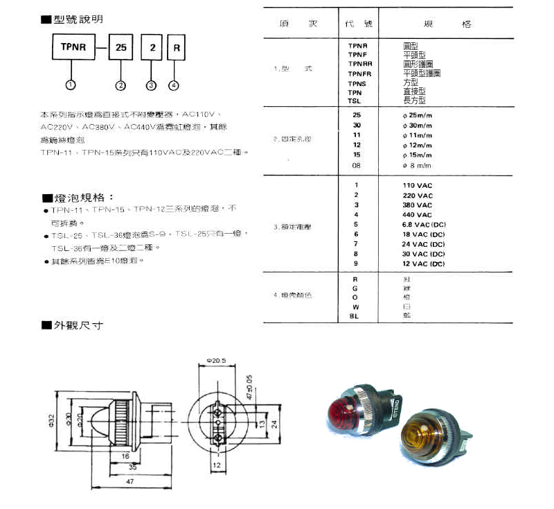 | 28446 | TPNR-257-G | 24V | 綠色 | 25mm | E10 鎢絲燈泡 |