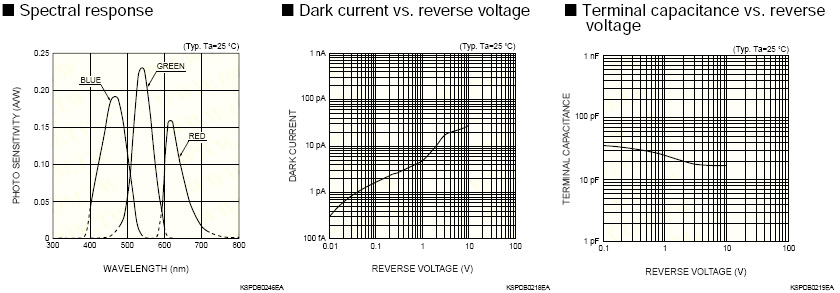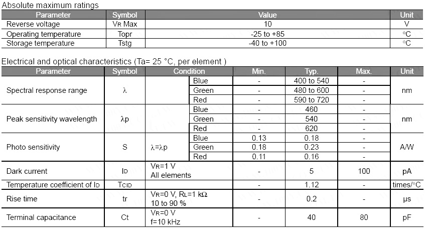 S9032-02 is a color sensor molded into a plastic package having a 3-channel (RGB) photodiode sensitive to the blue (λp=460 nm), green (λp=540 nm) and red (λp=620 nm) regions of the spectrum. S9032-02 has a 3-segment (RGB) circular active area of φ2 mm.