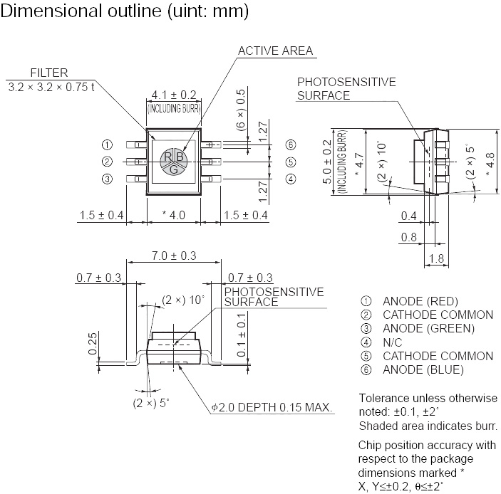 ●Active area: 3-segment (RGB) circular active area of ?p2 mm