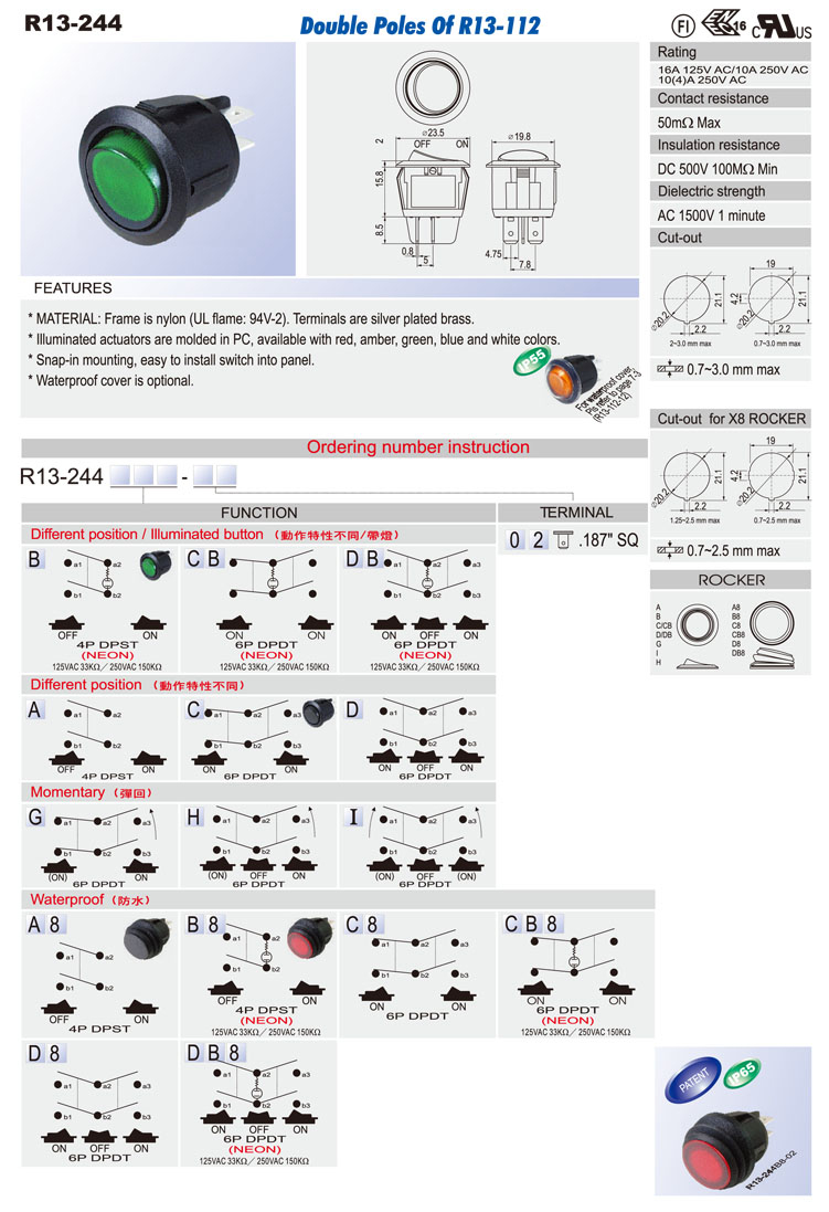 | 14325 | R13-244B-B/G | DPST ON-OFF | 16A125V 10A250V |