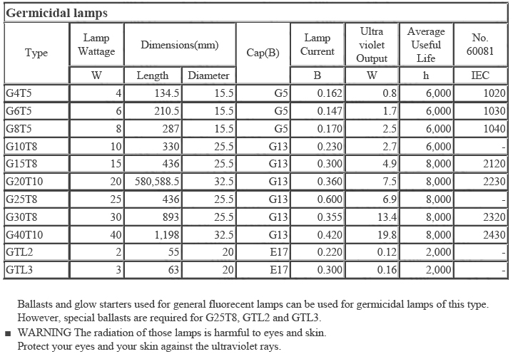 Germicidal lamps effciently emit a large amount of ultraviolet rays 253.7nm (nanometers) which have excellent germicidal effect. These lamps have structures and electrical characteristics similar to those of general fluorescent lamps used for illumination but use ultraviolet ray glass which efficiently transmits ultraviolet rays at 253.7nm. A large selection is available with different sizes, shapes and ultraviolet ray output so that the most appropriate one can be selected according to the purpose. The lamps are primarily useful for sterilization of air, the surfaces of various materials and water or liquid.