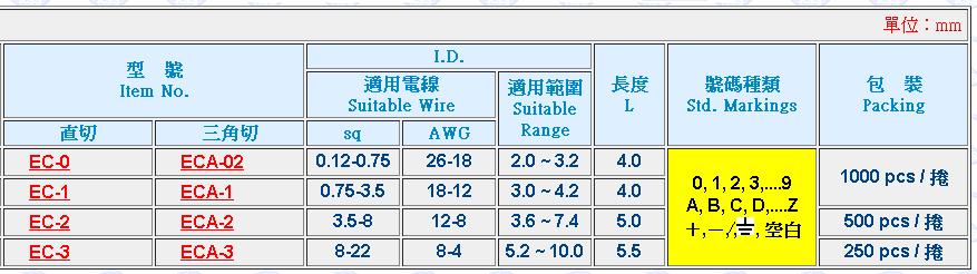 構造:EC型標誌內部成凹型,具有彈性,內徑能隨電線大小而伸縮