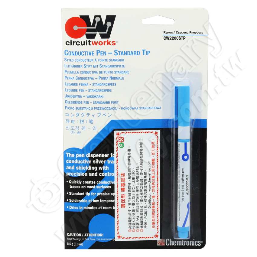 CircuitWorks® Conductive Pens make instant highly conductive silver traces on circuit boards and are used in prototype, rework, and repair of circuit boards by linking components, repairing defective traces, making smooth jumpers. The silver traces dry in minutes and have excellent adhesion to most electronic materials. Engineers, repair technicians, and manufacturers will find that the CircuitWorks® Conductive Pen speeds project completion and cuts rework time.