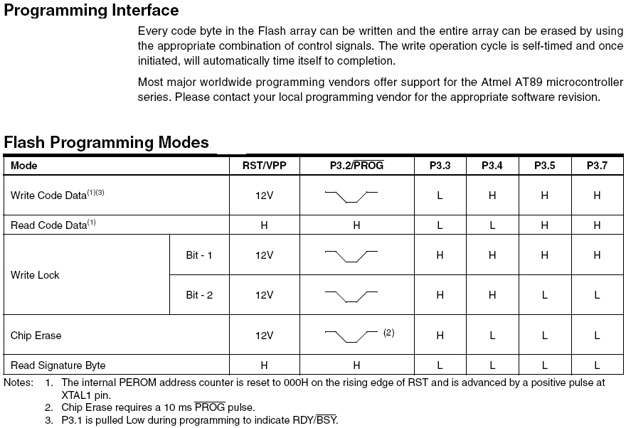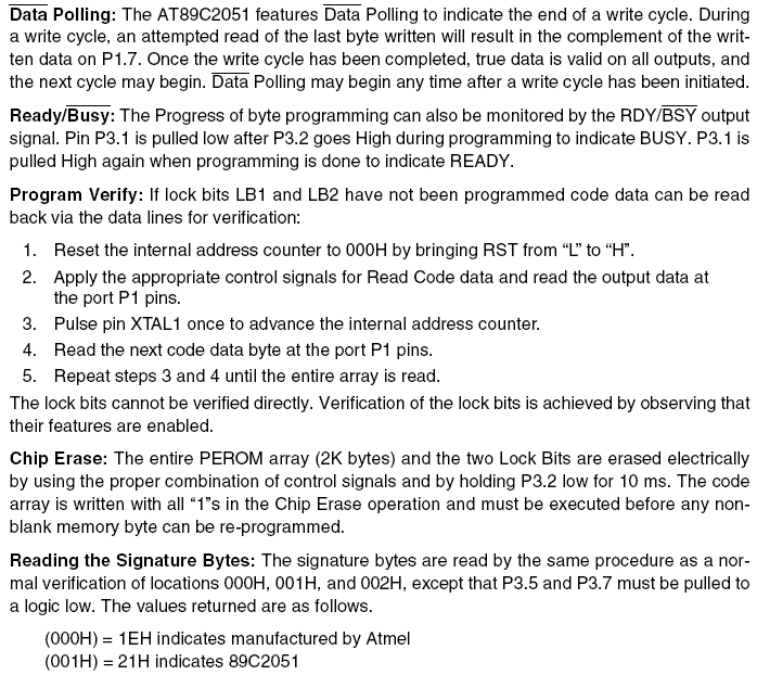 The AT89C2051 is shipped with the 2K bytes of on-chip PEROM code memory array in the erased state (i.e., contents = FFH) and ready to be programmed. The code memory array is pro-grammed one byte at a time. Once the array is programmed, to re-program any non-blank byte, the entire memory array needs to be erased electrically.