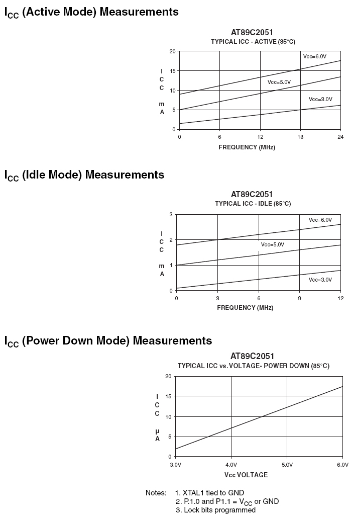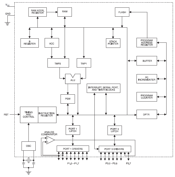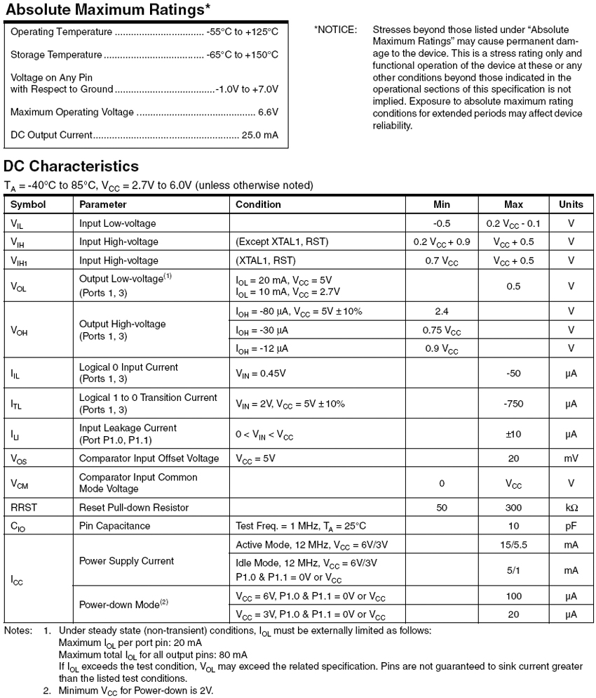 The AT89C2051 provides the following standard features: 2K bytes of Flash, 128 bytes of RAM, 15 I/O lines, two 16-bit timer/counters, a five vector two-level interrupt architecture, a full duplex serial port, a precision analog comparator, on-chip oscillator and clock circuitry. In addition, the AT89C2051 is designed with static logic for opera-tion down to zero frequency and supports two software selectable power saving modes. The Idle Mode stops the CPU while allowing the RAM, timer/counters, serial port and interrupt system to continue functioning. The power-down mode saves the RAM contents but freezes the oscillator disabling all other chip functions until the next hardware reset.