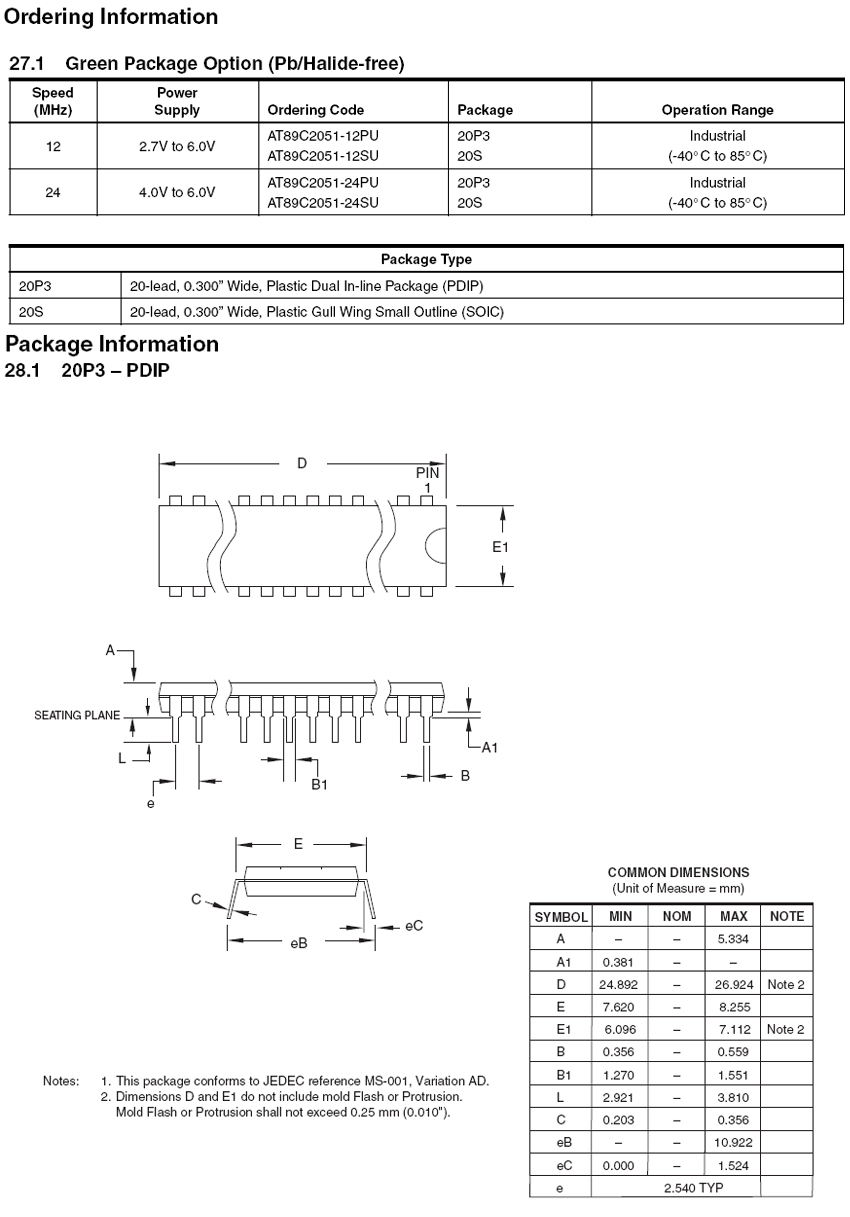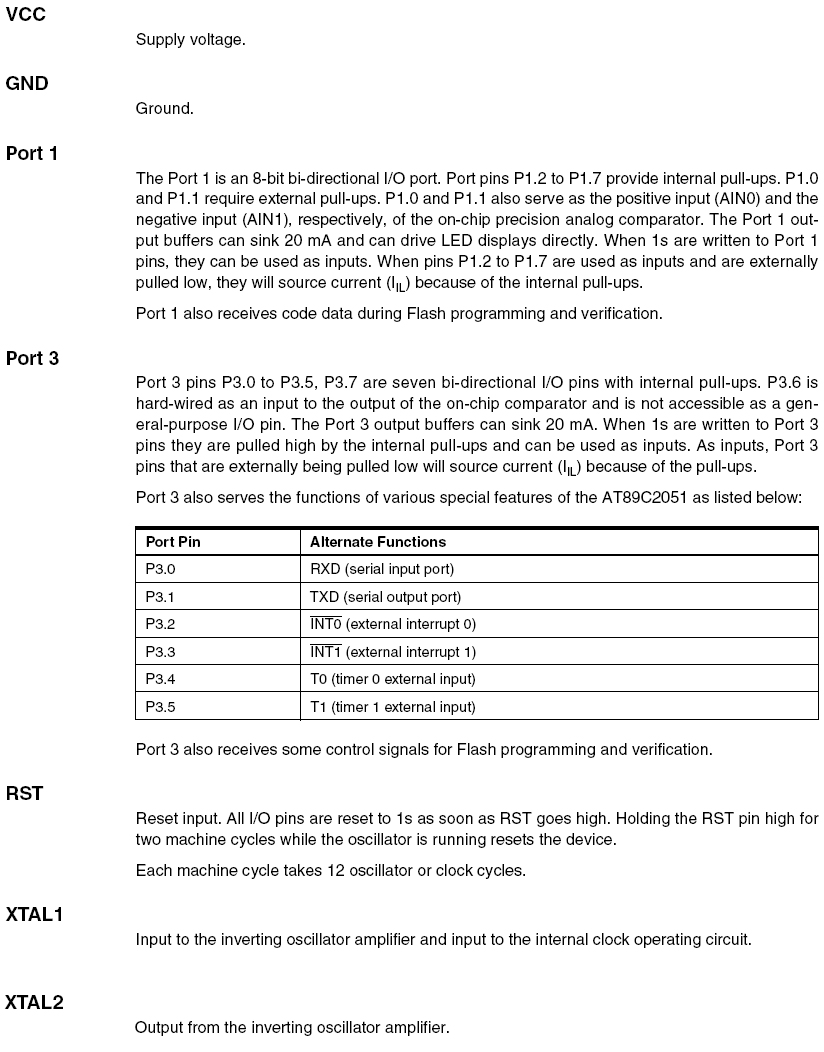 The AT89C2051 is a low-voltage, high-performance CMOS 8-bit microcomputer with 2K bytes of Flash programmable and erasable read-only memory (PEROM). The device is manufactured using Atmel’s high-density nonvolatile memory technology and is compatible with the industry-standard MCS-51 instruction set. By combining a versatile 8-bit CPU with Flash on a monolithic chip, the Atmel AT89C2051 is a power-ful microcomputer which provides a highly-flexible and cost-effective solution to many embedded control applications.