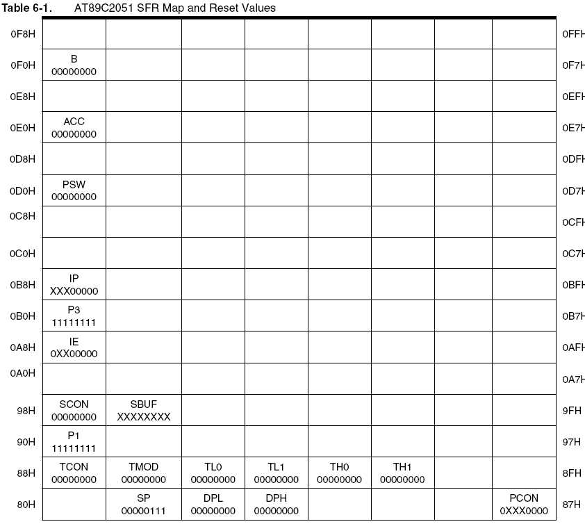 A map of the on-chip memory area called the Special Function Register (SFR) space is shown in the table below. Note that not all of the addresses are occupied, and unoccupied addresses may not be imple-mented on the chip. Read accesses to these addresses will in general return random data, and write accesses will have an indeterminate effect. User software should not write 1s to these unlisted locations, since they may be used in future products to invoke new features. In that case, the reset or inactive values of the new bits will always be 0.