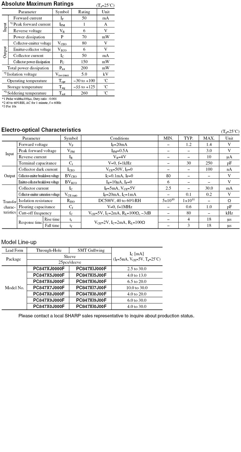 PC847XJ0000F Series contains an IRED optically coupled to a phototransistor. It is packaged in a 4-channel package, available in SMT gullwing lead-form option. Input-output isolation voltage(rms) is 5.0kV. Collector-emitter voltage is 80V and CTR is 50% to 600% at input current of 5mA.