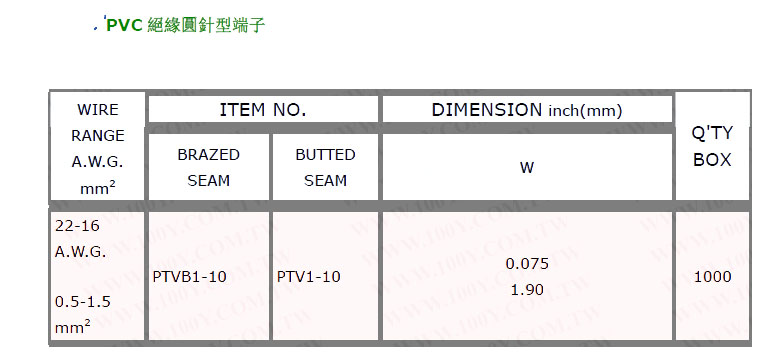 KST-PTV1-10 VINYL護套針型端子 (100個/包)【ROHS】