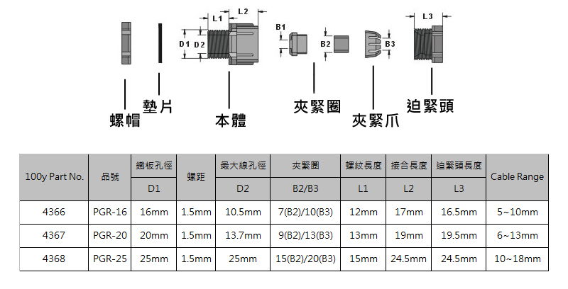材質:UL合格之NYLON 66(黑色)防火等級 94V-2,絕緣性佳,不易老化。